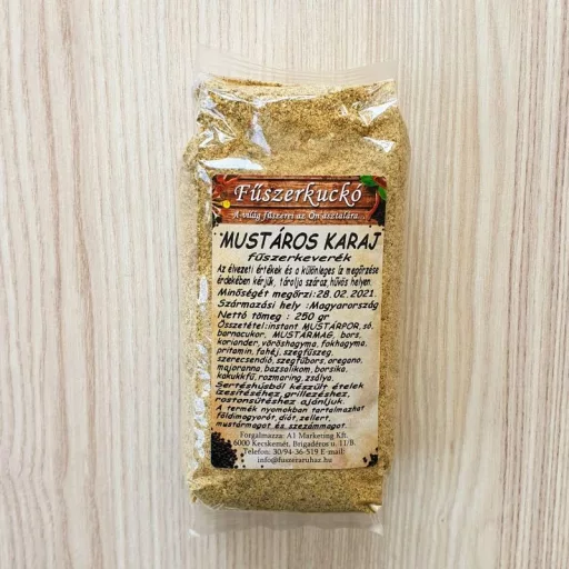 instant MUSTÁRPOR, só, BARNACUKOR, MUSTÁRMAG, bors, koriander, vöröshagyma, fokhagyma, pritamin, fahéj, szegfűszeg, szerecsendió, szegfűbors, oregano, majoranna, bazsalikom, borsikafű, kakukkfű, rozmaring, zsálya