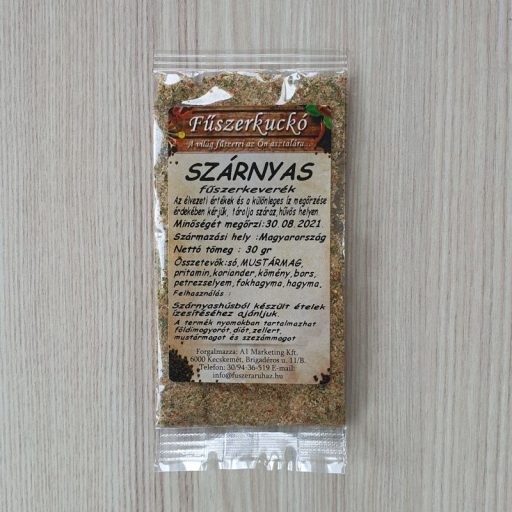 A szárnyas fűszerkeverék földimogyorót, diót, zellert, mustármagot és szezámmagot is feldolgozó üzemben készült.